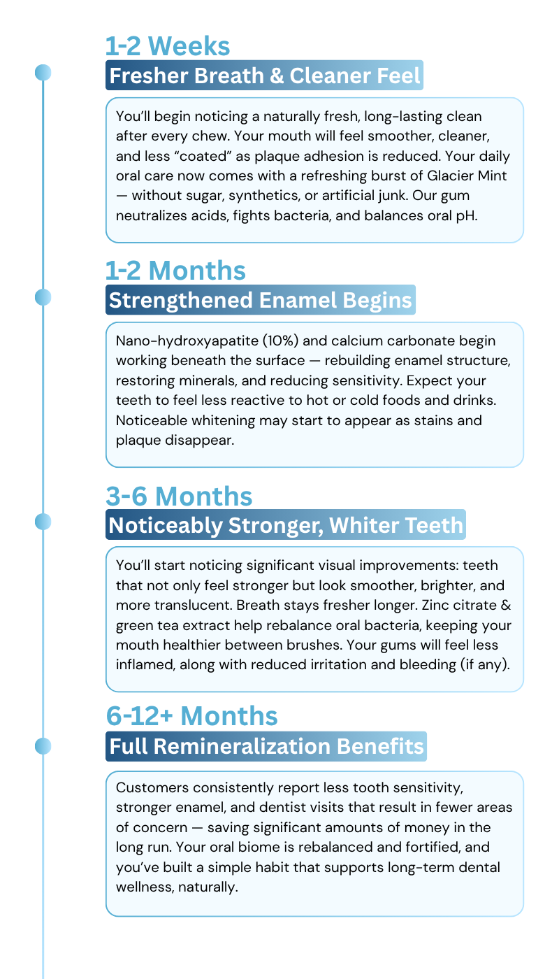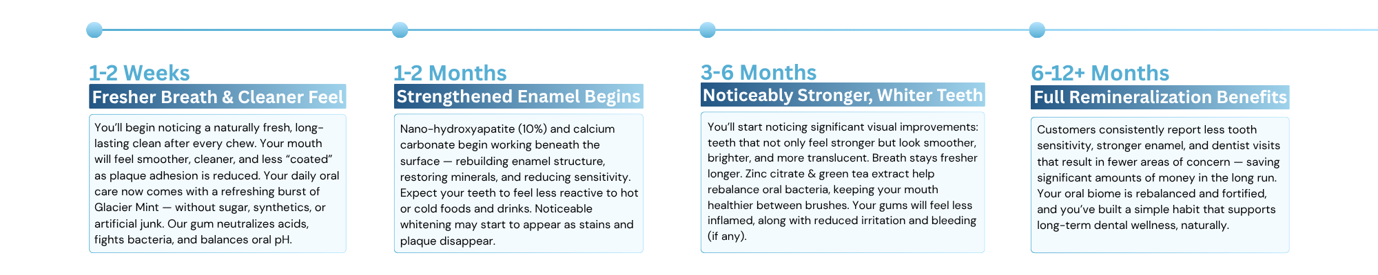 Most “functional” gums on the market use trace amounts of active ingredients — not enough to make a difference. We use 10% nano-hydroxyapatite (nHA) — the same concentration used in clinical trials for enamel repair. It’s significantly more expensive, but it’s what your teeth actually need.