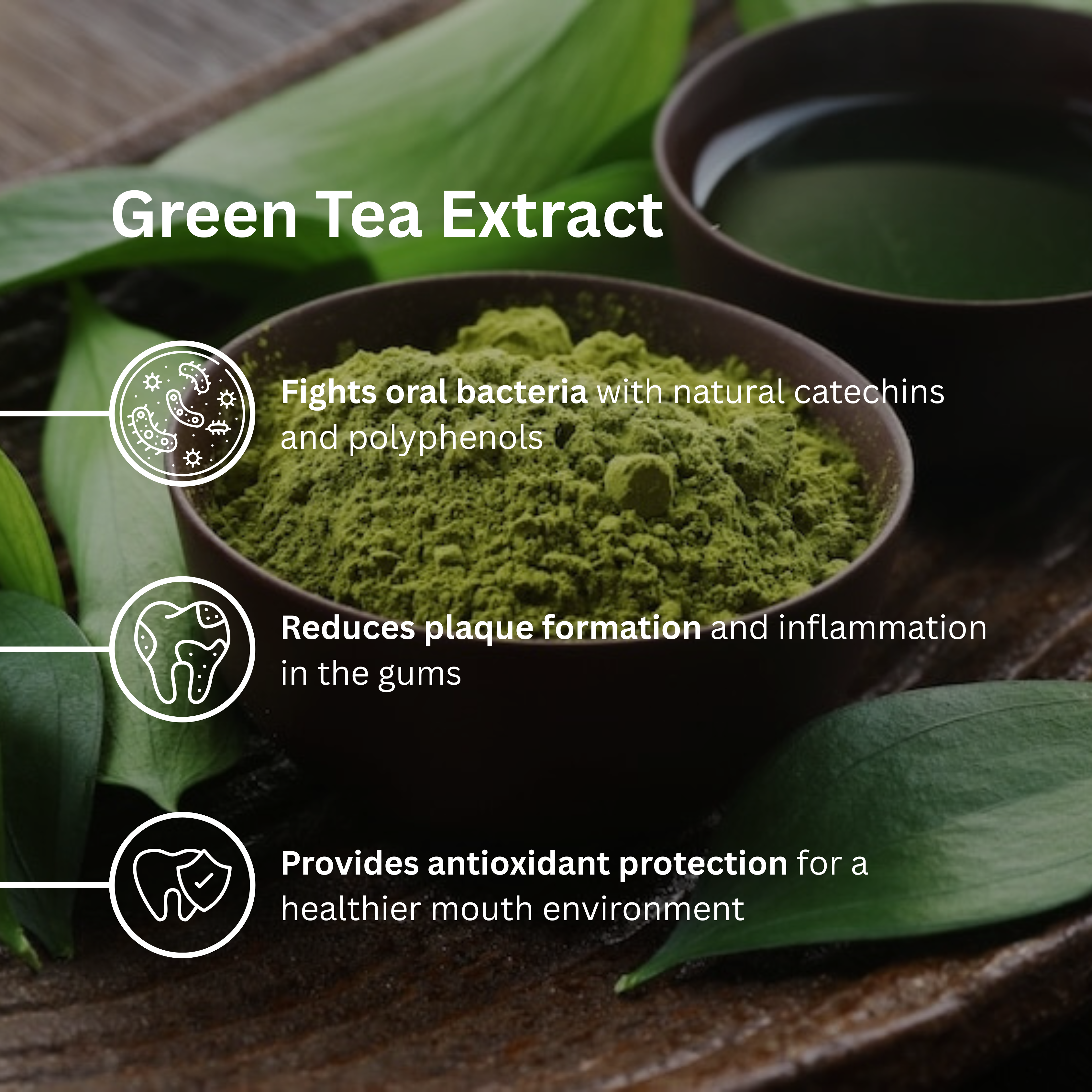 - Zinc citrate and green tea extract for gum health and oral biome support