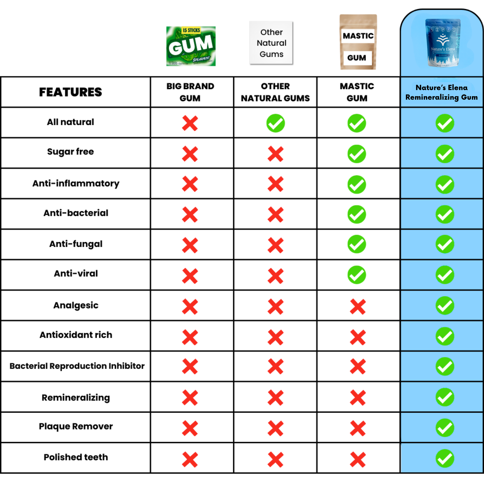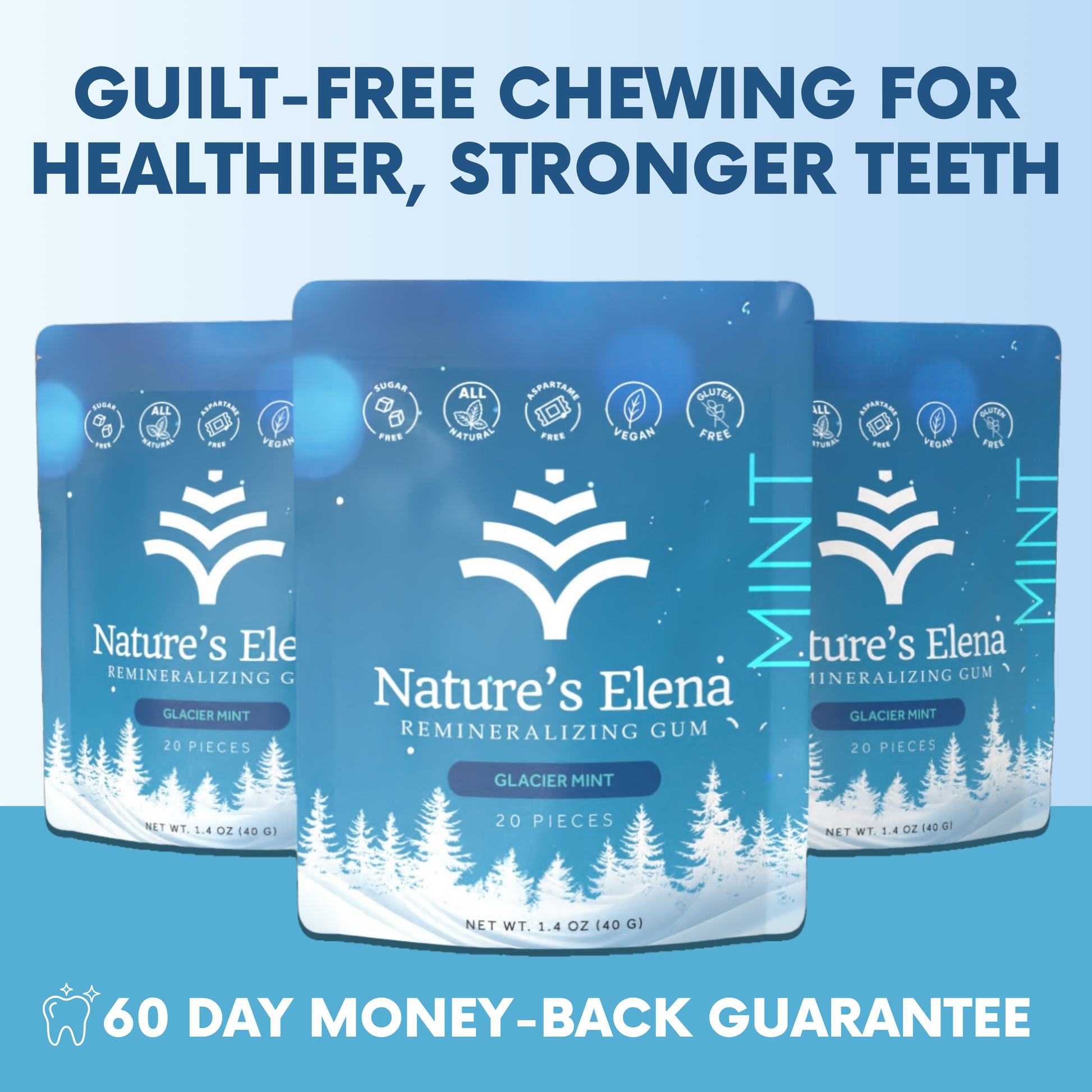 Nature's Elena Remineralizing Gum is a dentist-recommended, non-toxic, sugar-free chewing gum alternative that effectively remineralizes teeth to keep them strong, cavity-free, and naturally healthy. Our all-natural and vegan remineralizing gum restores and whitens enamel safely without harsh chemicals.