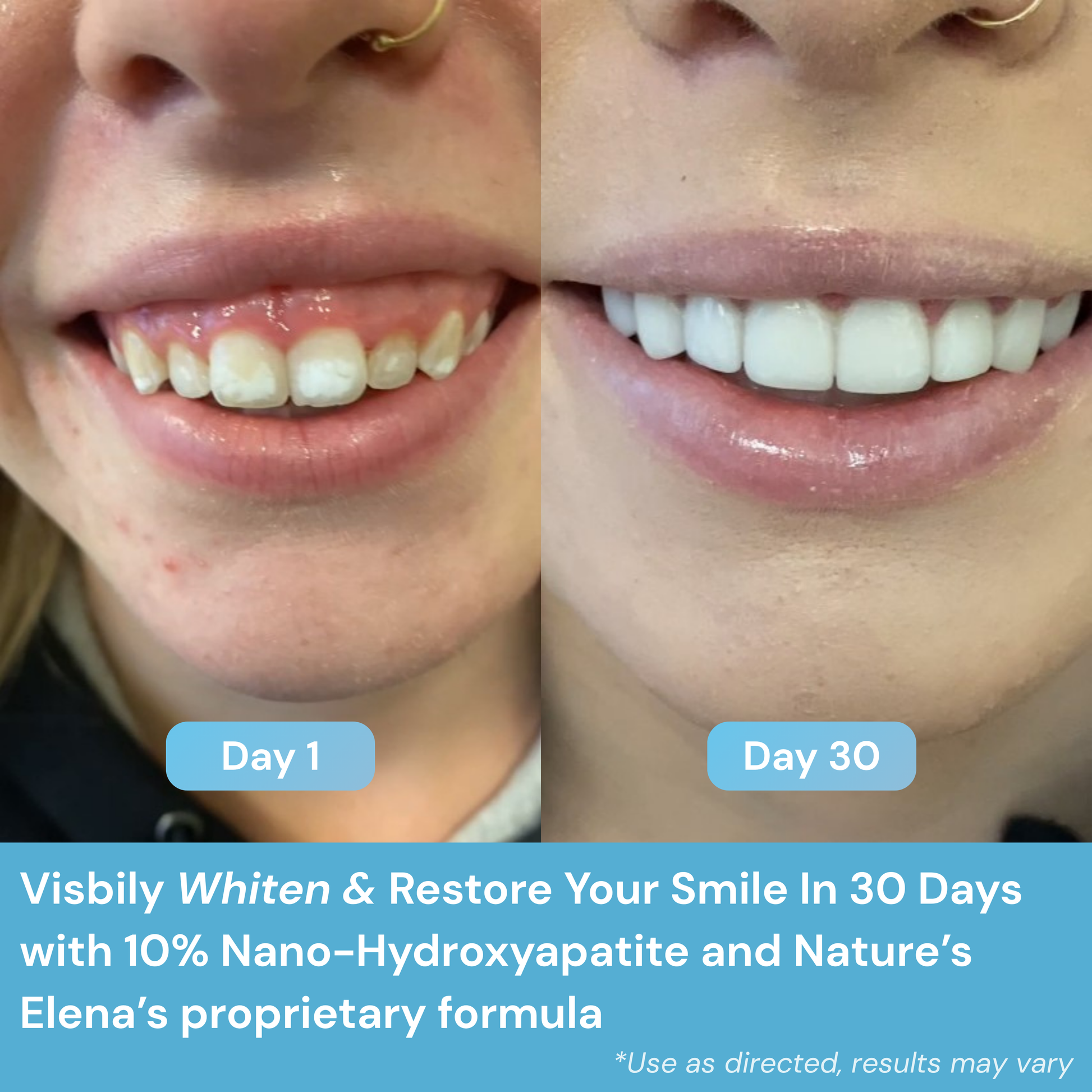 Nature's Elena contains 20nm nano-HA particles that progressively repair and strengthen your enamel over time. Not just surface-level improvement, but deep structural repair that you can actually see and feel.